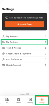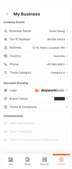 • Company branding configured in Settings > My Business (logo, colours, contact details)