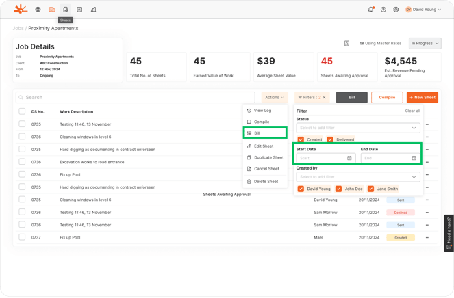 2. Select Billing Period: Choose approved sheets for the billing cycle (completion-based or contract interval)