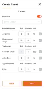 - Labour: Worker positions, worker names, standard rates, overtime rates, start/finish times