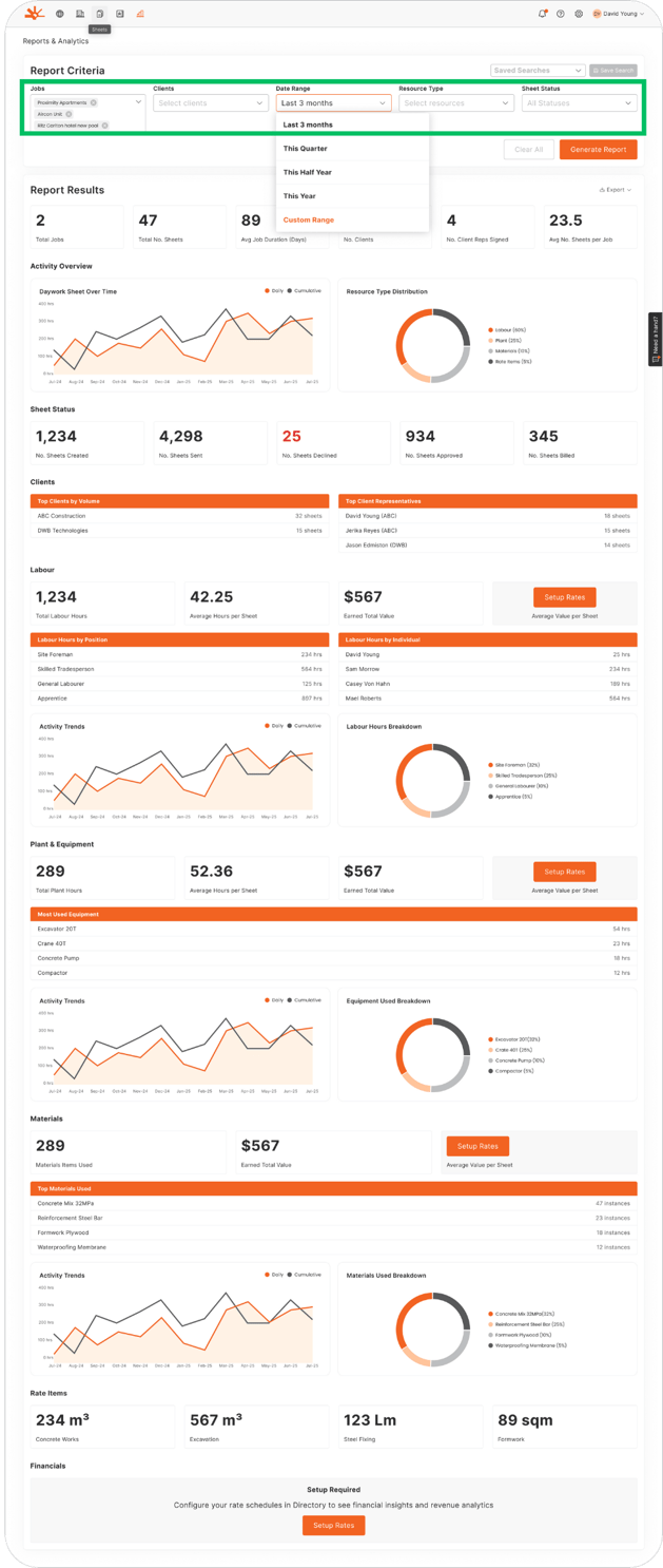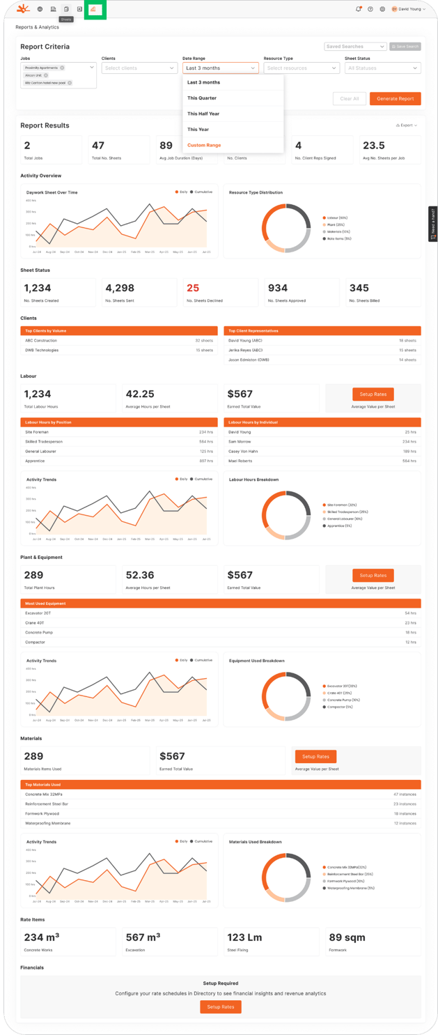 Master Dayworkbook's powerful reporting module to gain unparalleled insight into your organisation's daywork activities. Generate comprehensive reports with flexible filtering, visual analytics, and professional PDF exports to drive informed business decisions and enhanced productivity analysis.