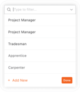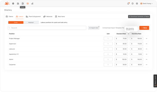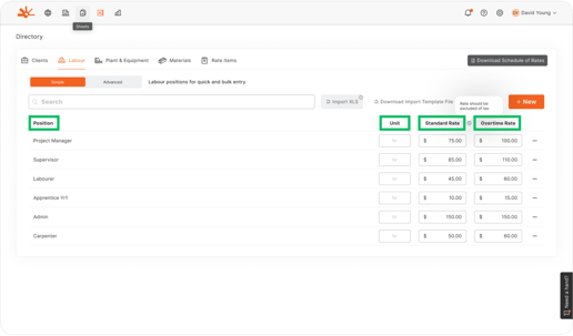 - List of standard labour positions (Project Manager, Tradesman, Apprentice, etc.)